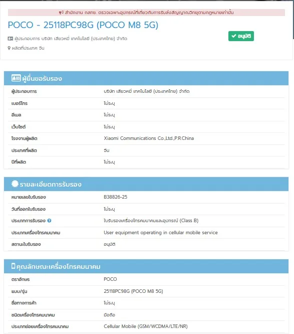 POCO M8 5G थाईलैंड के NBTC सर्टिफिकेशन डेटाबेस पर मॉडल नंबर 25118PC98G के साथ सामने आया है, जो इसके जल्द लॉन्च होने का संकेत देता है। सिंगापुर के IMDA, EEC और भारत के BIS से कई सर्टिफिकेशन मिलने के बाद, यह बजट 5G स्मार्टफोन आने वाले हफ्तों में वैश्विक स्तर पर लॉन्च के लिए तैयार है।